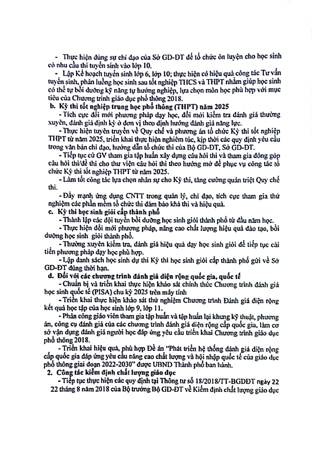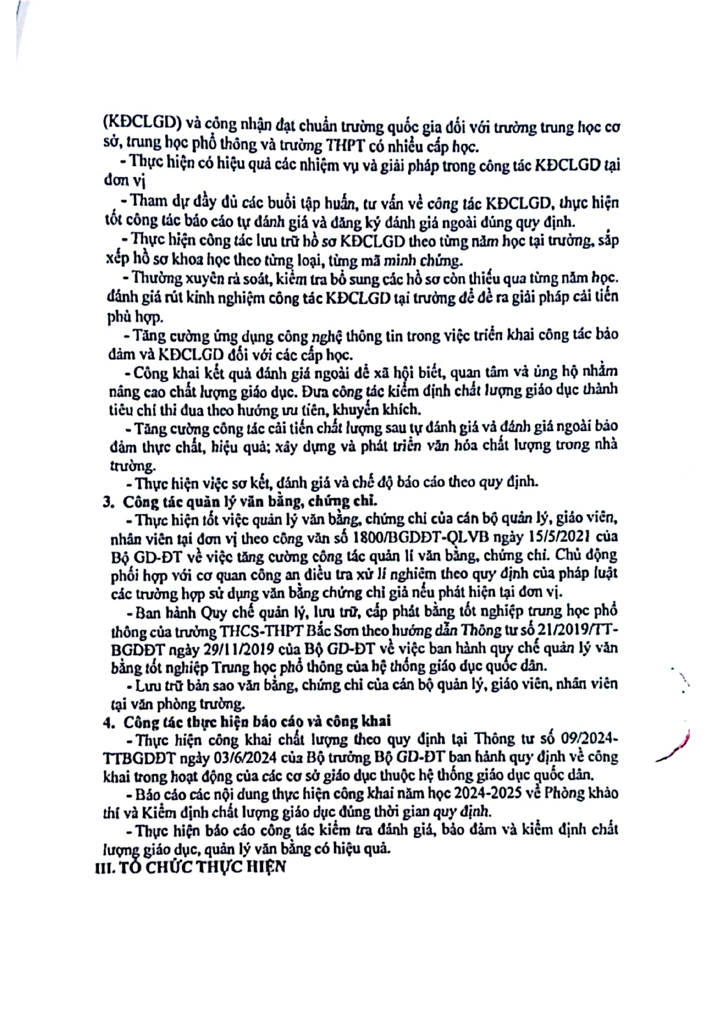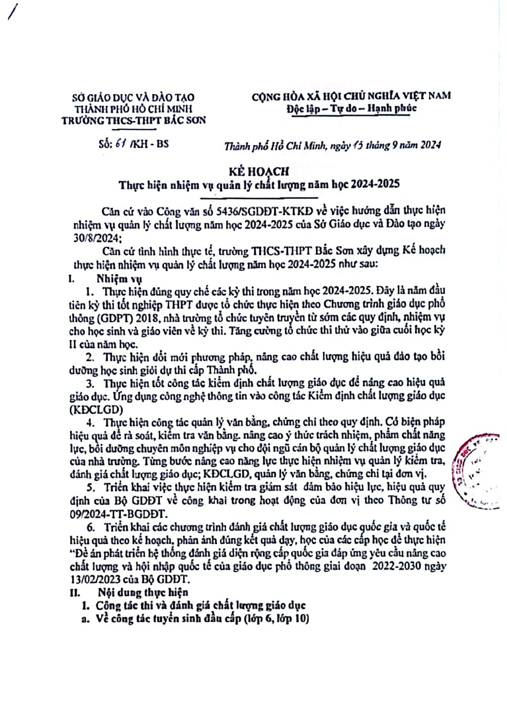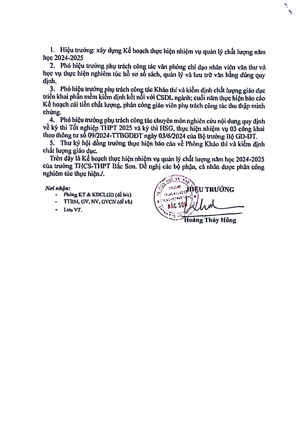 Kế hoạch thực hiện nhiệm vụ quản lý chất lượng năm học 2024-2025