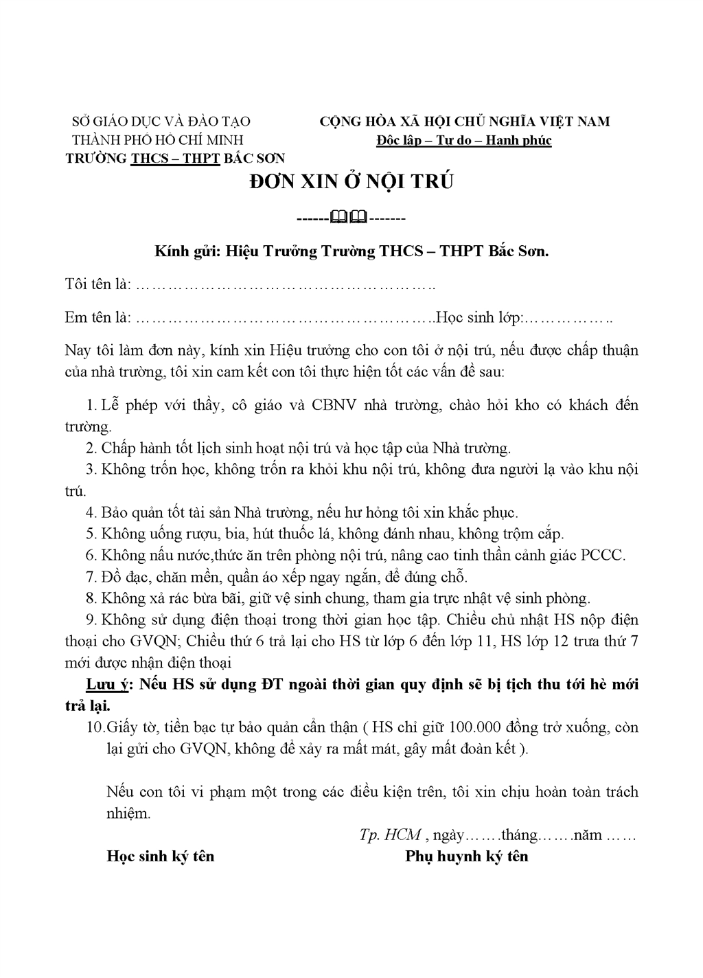 Mẫu đơn xin ở nội trú